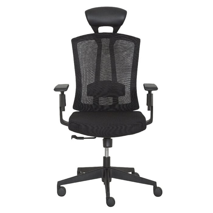 Respaldo tapizado en malla color negro y marco en polipropileno color negro y soporte lumbar ajustable. cabecera tapizada en vinil color negro, asiento tapizado en tela color negro y hule espuma inyectado de 53 kgs./m³, brazos en 3D con ajuste de altura en polipropileno negro, mecanismo ejecutivo con sistema de ajuste de altura, bloqueo antishock con 4 posiciones, piston ejecutivo y base en nylon de 27” con rodajas tipo yoyo en nylon negro, soporta peso de 150 kgs.