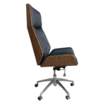 sillas ejecutiva madera Minimalista en Madera moldeada nogal , tapizado en piel Pu Capitonada , con base y posa pies en acero cromado y pistón hidráulico.